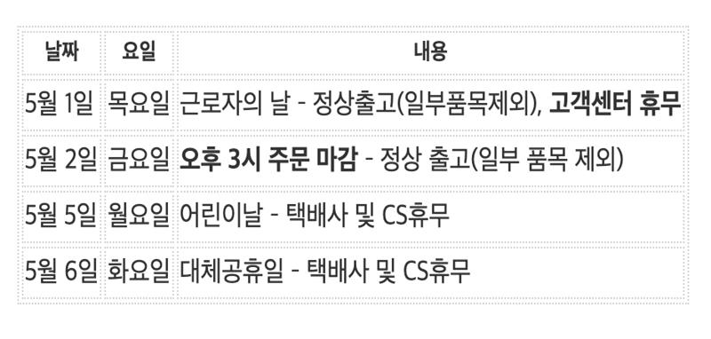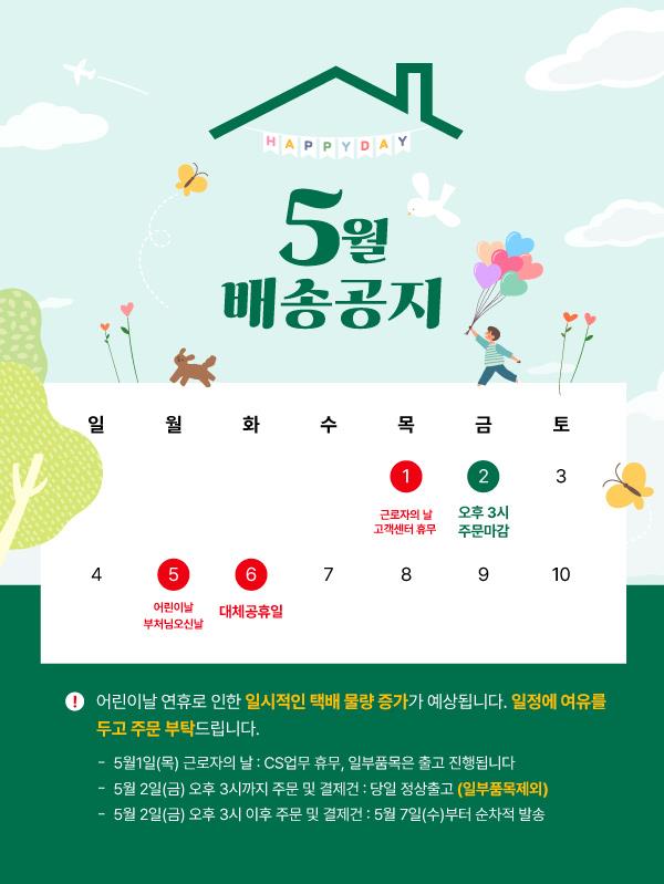 가정의 달 5월을 맞아 배송 일정을 아래와 같이 안내드립니다.