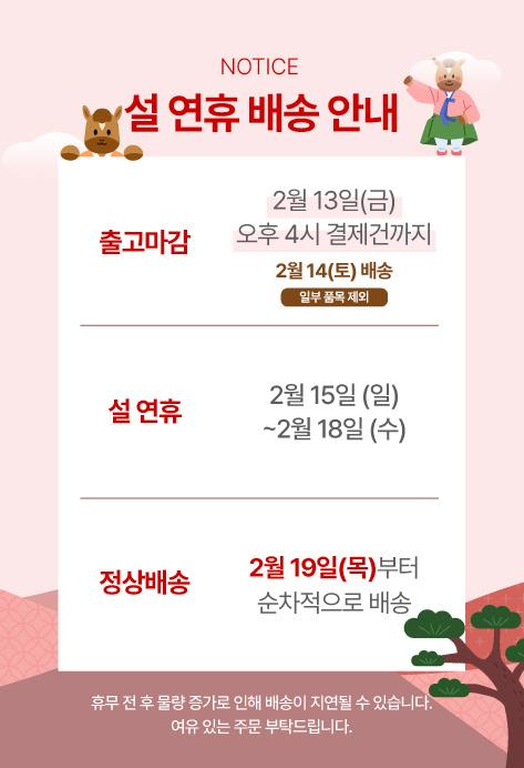 연휴 전 상품 수령을 원하실 경우, 2월 13일(금) 오후 4시 이전 주문을 추천드립니다.